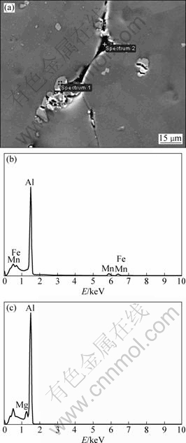 Fig. 4 SEM image of coarse-grained AlMg6Mn alloy (a) and corresponding EDS spectra of particles in spectrum 1 (b) and pores in spectrum 2 (c)