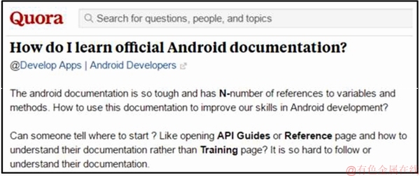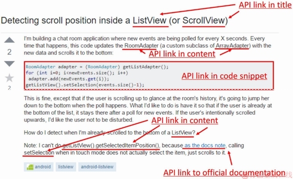 However, despite of its authoritativeness and thoroughness, the single-sourced official documentations do not always meet the developers’ requirements [6]. The Quora question in Figure 1 shows that the official documentation is not friendly for amateurs. Meanwhile, many developers turn to other knowledge sharing communities [7], like Stack Overflow and Wikis, and seek help from the crowds. By January 2018, over 1 million questions about Android have been posted to Stack Overflow, and about 16% of them are related to API(by searching API and Android in Stack Overflow).