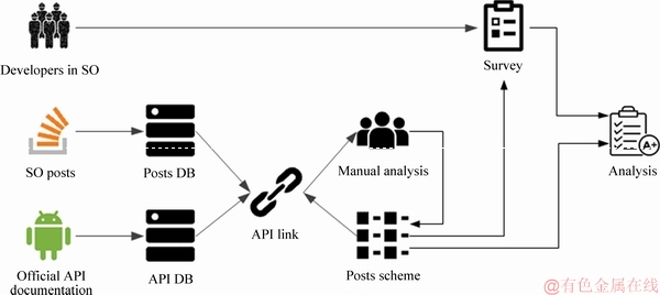 Firstly, we link Android API and Android-related posts, which is used to filter out posts discussing Android API. The detail process will be introduced in Section 3.4. Secondly, we use manual inspection to categorize the topics and causes of questions based on the posts which we select in process of linking API. In addition, we identify information provided in official documentation, which is used to compare different perspectives of API developers and users. The process will be described in Section 3.2. Then, we use the results of manual inspection to design a research survey, and deliver to users in Stack Overflow, as presented in Section 3.3. Finally, we combine the results of the manual inspection and online survey to get the conclusions in Section 4.