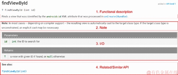 Related/similar API. Links to other APIs that are related or similar to the API. Android provides a huge number of APIs to API users, which may confuse them. This information is helpful for them to recognize the right API.