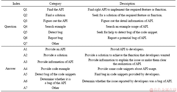 In manual inspection process, 10 master students handle total 1000 posts related to Android API from Stack Overflow, and each post is assigned to 2 students. Finally, they identify 6 main categories of questions, and 6 corresponding answers. The complete taxonomy schema of questions and answers is shown in Table 2, and for each category, we provide a short description to interpret. Also, we would like to point out that it is a common phenomenon that a single question and answer might belong to multiple categories.