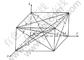 在3D编织纤维预制体中[9-11],纤维可供选择的主要方向有13个,分别是x,y和z 3个主轴,正立方体的T,U,V和W 4个主对角线和正立方体在各个坐标平面的对角线K,L,M,N,R和S(见图7)。三维四向编织结构的纤维取向为T,U,V和W 4个方向,即正立方六面体的4个主对角线方向。