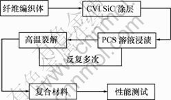 采用CVD+PIP联合工艺制备C/SiC复合材料,碳纤维表面CVD SiC涂层采用三氯甲基硅烷(MTS)为原料制备,H2为载气及催化剂,Ar为稀释气体,反应沉积温度为1 050 ℃[4]。将PCS与二甲苯按50%(质量分数)的浓度配成溶液,浸渍然后在1 200 ℃氮气保护下高温裂解,反复浸渍-裂解多次,使C/SiC复合材料致密化。具体工艺流程如图1所示。
