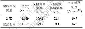 在编织过程中,不同编织方法对纤维造成的损伤也有所不同。本文作者分别采用2.5D和三维四向结构的JC碳纤维编制体,经过1 h化学气相沉积碳化硅涂层后,再进行先驱体浸渍裂解,反复多次后制得C/SiC复合材料,所制备的复合材料性能如表1所示。