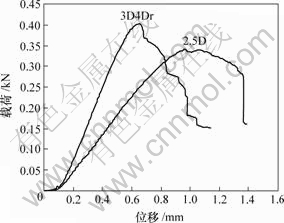 图4所示为2.5D编织结构复合材料和三维四向编织结构复合材料的垂直于x方向的弯曲强度的载荷-位移曲线。由图4可以看出,编织复合材料在应力峰值区出现了一段形状或长或短的平台,复合材料在这段区域内保持了较高的强度,而不是像单向复合材料那样一达到峰值立即断裂,由此可以认为编织结构复合材料改善了复合材料的断裂行为,大大减小了发生脆断的可能性,提高了复合材料的可靠性。单向复合材料是用增强纤维无维布一层一层铺排起来的,若假设纤维的长度方向为x方向,则单向复合材料在y和z方向上几乎没有任何加强措施。一般而言,纤维的拉伸强度比基体强度高很多,根据复合材料强度定则,复合材料的高强度主要是依靠纤维的高强度来获得的,基体作用主要在于固定纤维的位置和复合材料的外形,使纤维和基体能共同发挥作用,这样单向复合材料在y(宽度)方向和z(厚度)方向上的性能存在先天不足。