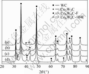 Fig.2 XRD patterns of WC-6Co carbon-deficient cemented carbides by Sinter-HIP: (a) Alloy A; (b) Alloy B; (c) Alloy C; (d) Alloy D