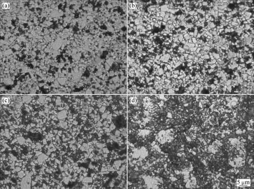 Fig.3 Microstructures of WC-6Co carbon-deficient cemented carbides by Sinter-HIP: (a) Alloy A; (b) Alloy B; (c) Alloy C;(d) Alloy D