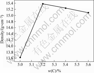 图4所示为不同烧结温度下合金的密度随着碳含量的变化。可以看出,随着碳含量的增加,合金的密度均先大幅度增加后逐渐缓慢减少;在碳含量为5.2%时合金的密度出现最大值。其原因在于:碳含量为5.0%时,缺碳太严重,整个烧结过程中,液相量较少,难以达到完全致密,从而导致密度过低;随着碳含量的增加,烧结过程中的液相生成数量大增,促进烧结致密化的进行,合金密度在碳含量为5.2%时达到最大值;继续增加原料粉末中的碳含量,由于近全致密的合金中的石墨含量增加,导致合金的密度下降。