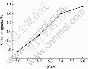 钴磁表示合金在磁场中能被磁化的钴(具有磁化机构的钴)占合金质量(被测合金)的质量分数,是直观反映合金的磁性钴尺度而间接评定碳含量的一个参数。图5所示为烧结合金的钴磁随碳含量的变化。由图可知,钴磁随着混合原料中碳含量的增加而增加。