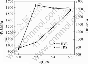 Fig.6 Effects of carbon content on Vickers hardness and TRS of carbon-deficient cemented carbides