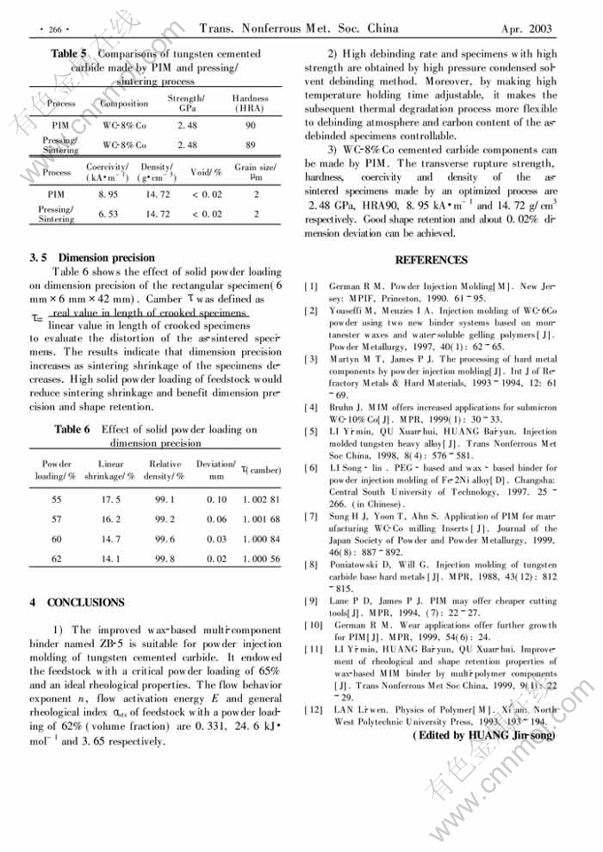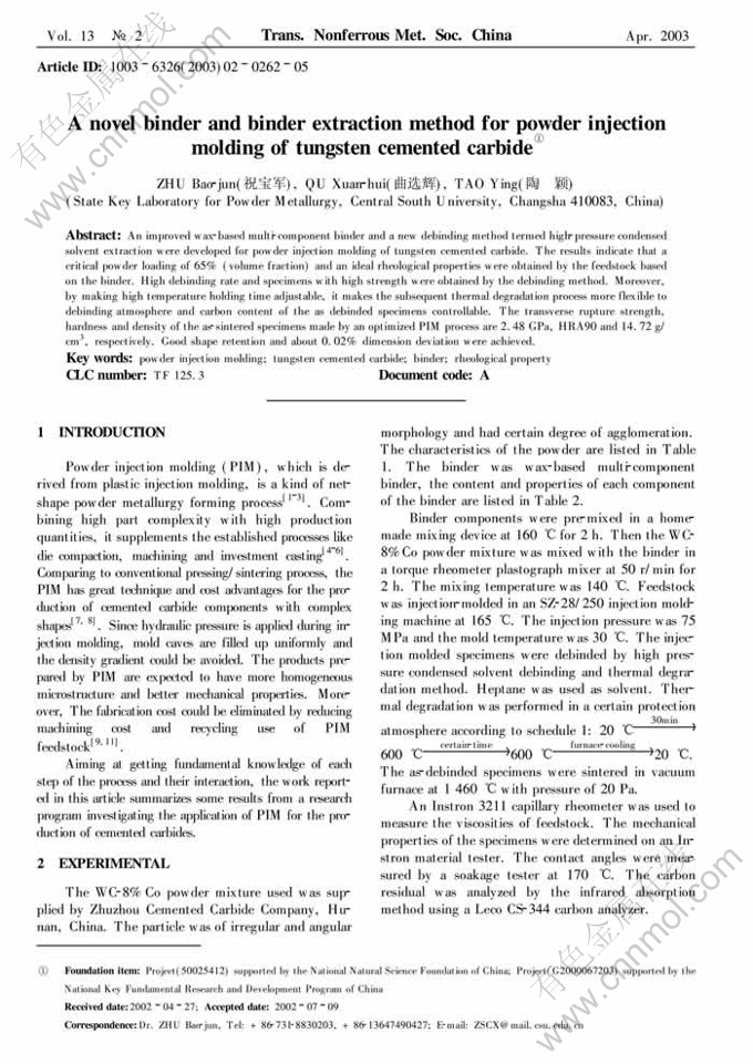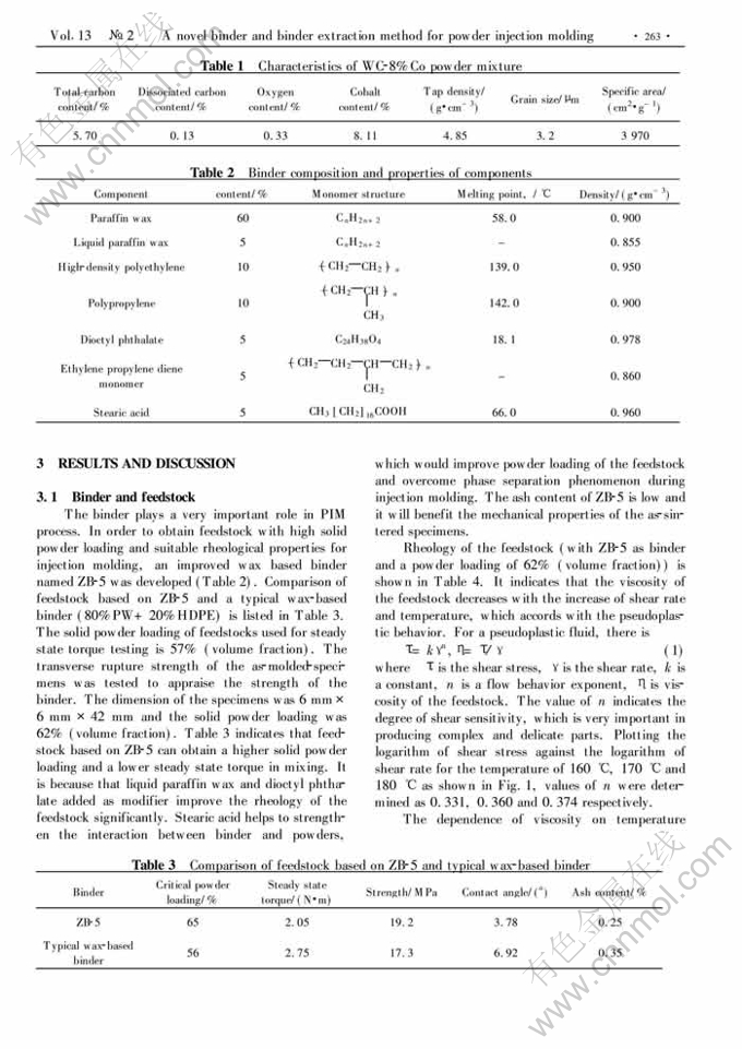 Key words:powder injection molding; tungsten cemented carbide; binder; rheological property