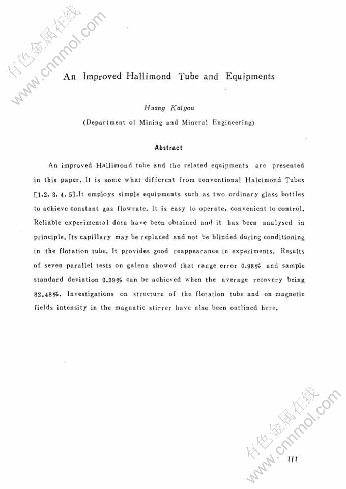 Abstract: An improved Hallimond tube and the related equipments are presentedin this paper.It is some what different from conventional Haleimond Tubes[1.2.3.4.5].It employs simple equipments such as two ordinary glass bottlesto achieve constant gas flowrate.It is easy to operate,convenient to control.Reliable experimental data have been obtained and it has been analysed inprinciple.Its capillary may be replaced and not be blinded during conditioningin the flotation tube.It provides good reappearance in experiments.Resultsof seven parallel tests on galena showed that range error 0.98% and samplestandard deviation 0.39% can be achieved when the average recovery being82.48%.Investigations on structure of the flotation tube and on magneticfields intensity in the magnatic stirrer have also been outlined here.