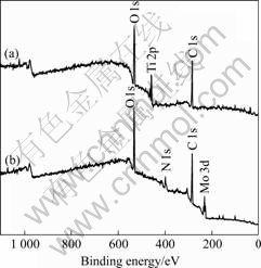 Fig.4 XPS survey spectra for surfaces of (a) Ti6Al4V alloy and (b) Mo-N modified layer