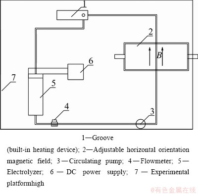 在原铜电解循环系统的基础上添加可调水平取向磁场进行设备设计与安装,整个试验系统由高位槽、可调水平取向磁场、循环泵、流量计、电解槽、直流电源、实验平台组成,如图 1 所示。其中,电解槽的尺寸为15 cm×15 cm×40 cm,有效体积为1 L,上面架设阳极铜和始极片,阳极铜的尺寸为10 cm×1 cm×15 cm,始极片的尺寸为10 cm×15 cm,阳极铜和始极片通过铜导线与直流电源(上海稳凯电源设备有限公司生产)的正极和负极连接。同时,电解液采用下进上出的循环方式,循环流速通过超声波流量计测量(江苏美安特自动化仪表有限公司生产),其大小通过阀门控制为0.02 m/s,高位槽内置加热装置,可调水平取向磁场装置由深圳怡天磁性材料有限公司制造,其磁感应强度B的可调范围为0~3 T。