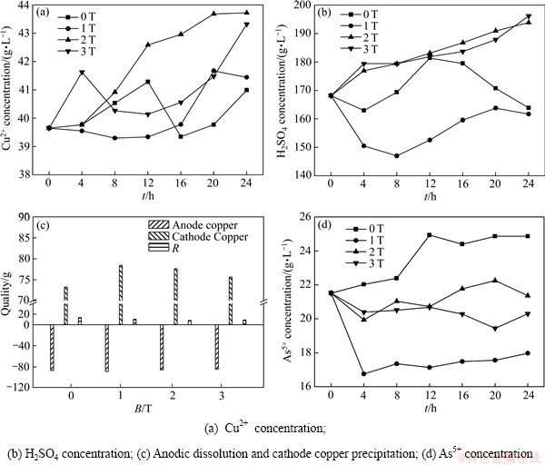 2.1 磁感应强度对磁化铜电解过程铜/酸的影响