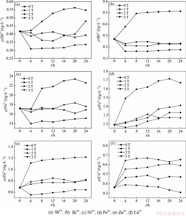 图3 磁感应强度对铜电解过程中杂质离子浓度的影响