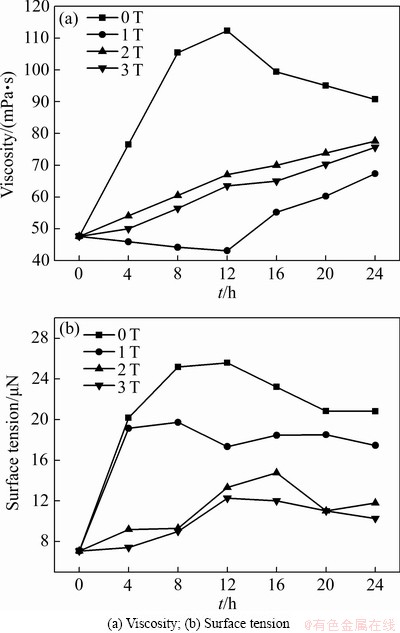 Fig. 5 Effect of magnetic field intensity on viscosity and surface tension