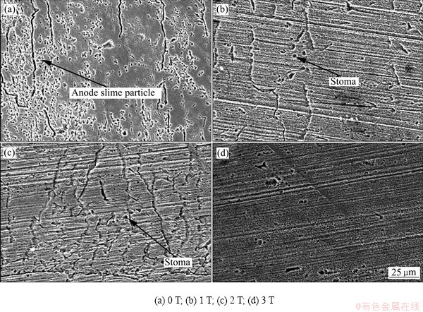 综上所述,结合图3和6,施加水平取向磁场,有助于提高电解液的清晰度和阴极铜的表观质量。