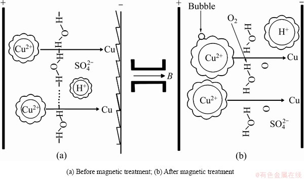 2) 铜电解过程中,电解液由于磁场梯度力的作用,水分子的磁能转化为体系能量,导致氢键缔合程度降低,Cu2+扩散速度加快,电解液中的气泡增多,阴极铜表面易形成气孔;但铜离子活性降低,Cu2+离子水合作用加强,减弱微气泡聚合,阴极铜的表观质量得到改善,表面无气孔。同时,Cu+的歧化反应被抑制,铜损失量降低,阳极溶解速度和阴极铜析出速度降低,因此,水平取向磁场作用于铜电解过程存在最佳磁感应强度。