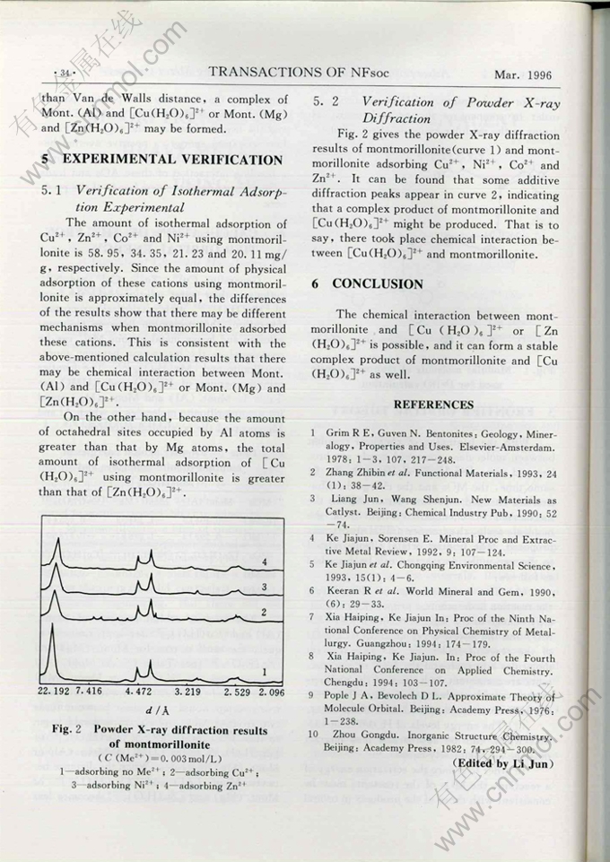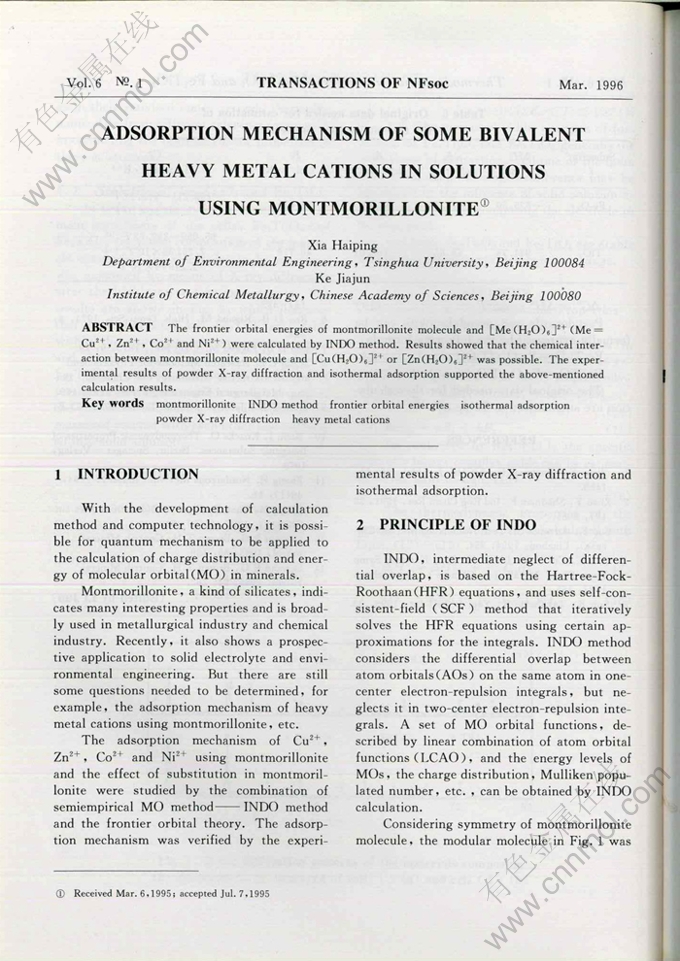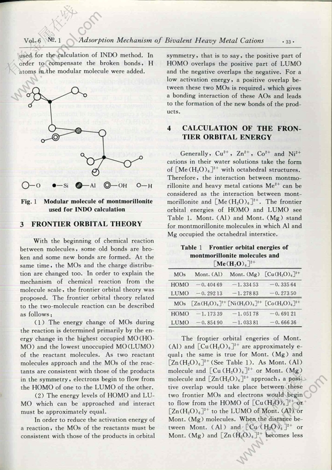 Key words:montmorillonite; INDO method ; frontier orbital energies ; isothermal adsorption ; powder X-ray diffraction ;heavy metal cations