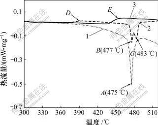 Al-7.8Zn-1.6Mg-1.8Cu合金(7085型)铸态及其经不同均匀化制度处理后试样的DSC曲线如图1所示。可以看出:该合金铸态样品测试曲线上在475 ℃有 1个明锐的吸热效应(A点),此效应为铸态基体中非平衡共晶组织熔化所形成;而试样H400的测试曲线上出现2个明锐的吸热效应(如图1中B点和C点)。B点的峰值温度为477 ℃,C点峰值温度为483 ℃,也就是说,在DSC升温过程中,H400试样中有2个第二相发生了溶解或熔化。比铸锭样品高2 ℃的吸热效应(B点)是非平衡共晶熔化产生的,因为在均匀化过程中,随着非平衡共晶的逐渐溶解,其熔点会逐渐增大。H470样品的DSC曲线上没有发现明锐的吸热或放热效应。此外,经过均匀化处理的试样在进行DSC加热时出现放热效应(D点和E点),并且均匀化温度越高,此类放热效应发生的温度也越高,而铸锭样品的DSC曲线上没有发现此类放热效应。此类放热效应发生的温度范围较宽,容易被忽略。
