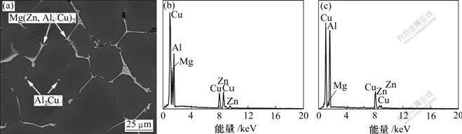 (a) Al-7.8Zn-1.6Mg-1.8Cu合金铸锭的背散射图; (b) 非平衡共晶组织EDS分析图; (c) 灰色球状第二相粒子EDS分析图