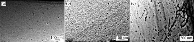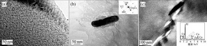 图4所示为该铝合金铸态组织的透射电镜照。从图4(a)可见:铸锭基体组织中有大量与基体呈共格状态,排列整齐的纳米级第二相,这是在凝固冷却过程中析出的非平衡态Al2Cu。此外,还发现游离的纳米级棒状粒子,如图4(b)所示。对其衍射特征花样标定(图4(b)中右上角),发现其为Al2Cu粒子,与扫描电镜下发现的微米量级Al2Cu粒子联系起来考虑,它们与基体没有晶体学位向关系,可以判定都是凝固结晶相。图4(b)中Al2Cu粒子尺寸小,还没长大成球状粒子。