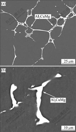 采用扫描电镜(SEM)研究不同均匀化制度处理后样品的微结构,其典型结果如图5所示。在H400样品中可以清晰地看到紧挨着Mg(Zn, Al, Cu)2相形成的新相(如图5(a)箭头所示),其占据原来Mg(Zn, Al, Cu)2相的位置,EDS分析表明新相中Al,Cu,Zn和Mg的摩尔分数分别为57.40%,17.33%,1.88%和23.39%,这与图1中的DSC曲线和图2中XRD谱检测到的Al2CuMg相成分含量相吻合。SH450样品的背散射图如图5(b)所示,从图中可以发现基体中仅剩下小部分的第二相粒子,EDS分析表明,其均为没有完全固溶到基体中的Al2CuMg相,此时已很难找出Al2Cu粒子。上述结果表明:由于Al基体中Cu和Mg原子的扩散速度比Zn原子扩散速度低,导致Mg(Zn, Al, Cu)2相溶解的同时也有一部分会转变为Al2CuMg相。