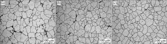 图6所示为经过不同均匀化处理后的金相(OM)图。从图6(a)可以看出,在H400样品的金相图中,虽然枝晶已大部分消除,但是,仍然可以清晰地看出晶界有一定宽度,且在部分三叉晶界交合处存在第二相。结合图2和图5(a)可判定晶界上及晶界交合处的第二相分别为铸造时形成的Mg(Zn, Al, Cu)2结晶相和均匀化过程中形成的Al2CuMg相。SH450(图6(b))样品中晶粒均匀,但部分晶界上仍存在部分黑色粒子,结合图5(b)可知其为Al2CuMg相。SH470样品(图6(c))晶粒均匀,晶界细小清晰,在其中很难找到第二相粒子。由此可见:随着均匀化温度升高到470 ℃,由Mg(Zn, Al, Cu)2结晶相转变而来的Al2CuMg相溶入基体。