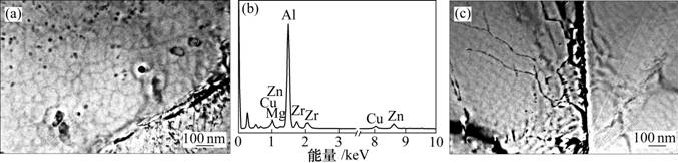 从图8(a)可以看出:在SH450试样中,Al3Zr粒子在靠近晶界区域析出的数量少于晶粒内部析出的数量,且尺寸显著增大,但与H450(图8(c))相比,其晶界附近区域Al3Zr粒子析出量明显增多。由于Al和Zr元素熔点差距大,在合金铸锭凝固过程中,Zr元素的高熔点特性使Zr原子易成为结晶核心,从而导致Zr原子产生晶内偏析。Robson[11]报道了7050合金铸锭中Zr原子在枝晶臂中部聚集密度高于在晶界聚集的密度,经过均匀化处理后,Al3Zr粒子在晶粒不同区域的分布存在明显差异。研究所用的7085型铝合金的Zr含量与7050合金的Zr含量相似,采取两级均匀化处理(如SH450,SH470),在低温保温 (400 ℃/12 h)时,在靠近晶界处Al3Zr粒子可能会在未溶解的Mg(Zn, Al, Cu)2和转化的Al2CuMg粒子上异质形核析出、长大,于是,便出现了如图8(a)所示的Al3Zr粒子(其能谱图见图8(b))析出行为。而直接采用较高温度的单级均匀化处理(如H450试样),由于晶界处的Mg(Zn, Al, Cu)2相较快地溶入基体,减少了Al3Zr粒子可能异质形核的位置,所以,在晶界附近只有很少的Al3Zr粒子析出(如图8(c))。