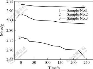 Fig.1 shows the mass of the samples measured in different soaking periods. Generally, the mass changes were very small for all the three types of samples. After 242 h soaking, pure magnesium exhibited the best corrosion resistance with 0.9% mass loss, followed by Mg-5.6Zn-0.55Zr-0.9Y with 1.7% mass loss and Mg-5.4Zn-0.55Zr(ZK60) with 3.1% mass loss.