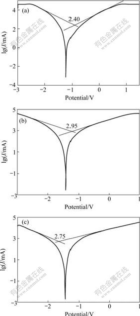 Fig.2 Tafel curves of samples: (a) Pure Mg; (b) ZK60; (c) Mg- 5.6Zn-0.55Zr-0.9Y