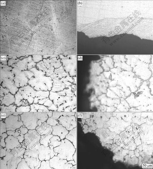 Grain boundaries were hardly detected on Mg alloys with the addition of Zn and Y. The microstructure exhibited a network of a black compound, which was a Zn-enriched phase. From Fig.3, it was observed that sample No.1 had a very thin corrosion layer with a flat boundary, which implied that corrosion centralized on the surface, while sample No.2 and No.3 were seriously corroded and corrosion mostly occurred in the boundary area.