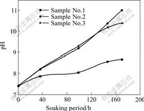 Fig.4 shows the variation of pH value during 170 h of corrosion process. The pH value of pure Mg changed slowly in the whole process, while that of ZK60 changed quite fast with the pH value maintaining at 11.2 after 170 h.