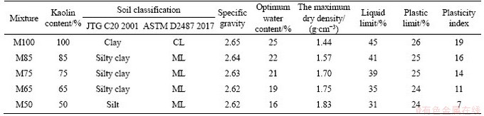 Previous studies have shown that as the coarse grain content increases, a binary mixture can be divided into three states: 1) coarse grain floating state, 2) transitional state, and 3) coarse grain contact state [29]. Specifically, CHANG et al [30] stated that when the fines content is larger than 35%, most of coarse grains are dispersed in the mixture, and thus the soil behaviour is mainly controlled by fine grains. In this study, the kaolin content is larger than 50%, so the majority of silt particles float in clay particles, which is consistent with the findings reported by CHANG et al [30].
