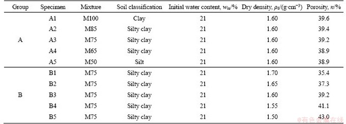 The procedure for specimen preparations was as follows: 1) the oven-dried clay (i.e. kaolin) powder and silt (i.e. fine quartz sand) powder were mixed together according to the desired mixing ratio (Table 2); 2) distilled water was mixed with the soil to bring its water content to 21%; 3) the wet soil was stored in an airtight container for over 2 d to reach a good water equilibrium; 4) the cured soil was filled into a cylindrical mould in three layers of approximately equal thickness and then compressed to the desired dry density (Table 2) using the static compaction method; 5) once the compaction procedure was completed, the soil specimen was carefully removed from the mould.