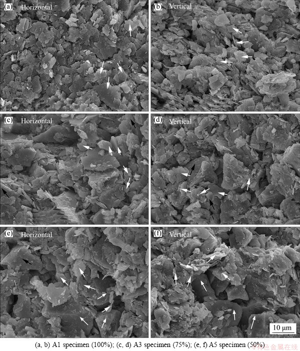 The SEM images of the horizontal and vertical planes of three representative specimens (i.e. A1, A3 and A5) with different kaolin contents are presented in Figure 3, in which white arrows represent clay (kaolin) particles and black arrows represent silt (fine quartz sand) particles. It is observed that clay particles are not gathered to form aggregates but well dispersed when the kaolin content is 100% (Figures 3(a) and (b)). Clay particles are mainly arranged in a face-to-face form because of compaction, so the pores are quite small (less than the average size of clay particles). As the kaolin content decreases, the face-to-face arrangement of clay particles is gradually disturbed because of the presence of silt particles. This leads to the formation of some relatively large pores around silt particles. The size of these pores generally approximates those of clay particles. However, one can note that at a kaolin content of 75%, most of silt particles float in clay particles. As the kaolin content decreases to 50%, more silt particles appear, and thus the preferred arrangement of clay particles by compaction seems completely destroyed. Furthermore, some silt particles get into contact with each other, leading to the presence of more large pores around silt particles.