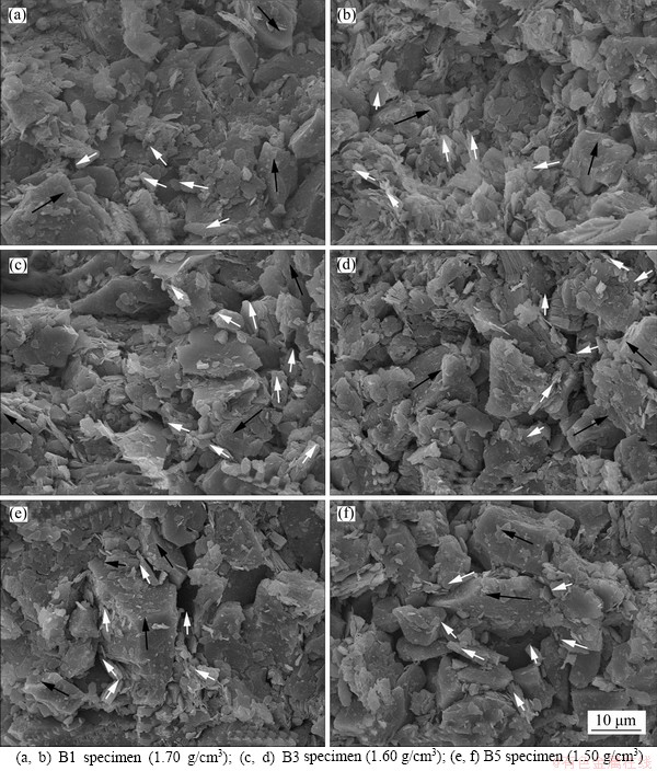 Figure 4 presents the SEM images of the horizontal and vertical planes of three representative silty clay specimens (i.e. B1, B3 and B5). Similarly, white arrows in Figure 4 represent clay (kaolin) particles and black arrows represent silt (fine quartz sand) particles. One can note that as the dry density increases, the pores around silt particles significantly decrease. Particularly, when the dry density of the specimen approaches 1.70 g/cm3 (i.e. the maximum dry density), clay particles fill well the gaps among silt particles, so there are very few pores larger than 1 μm in both the horizontal and vertical planes. In this case, the M75 silty clay reaches the densest state, which is in line with the compaction test results.