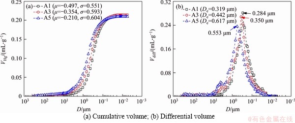 Figure 5 MIP test results of three specimens with different kaolin contents (A1-100%; A3-75%; A5-50%):