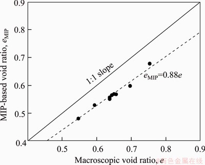 The relationship between the micro-void ratios measured by the MIP tests and the macro-void ratios (e) determined by conventional laboratory tests is presented in Figure 7. It is noted that the micro-void ratio is linearly correlated with the macro-void ratio. Generally, the values of eMIP are approximately 88% of e, which is broadly in line with the finding of GAO et al [26]. Actually, the result that the values of eMIP are slightly less than e, is reasonable since the MIP technique cannot take the closed, isolated pores into account.
