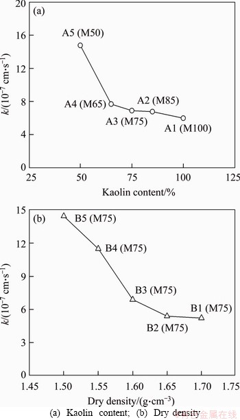 Figure 8 depicts the coefficients of permeability of all soil specimens affected by kaolin content and dry density. It shows that as the kaolin content changes from 50% to 100%, the coefficient of permeability exhibits a rapid decrease followed by a slow decrease. Particularly, the coefficients of permeability of the specimens (i.e. A5 and A1) with kaolin contents of 50% and 100% are 1.48×10-6 cm/s and 3.73×10-7 cm/s, respectively. The possible reason is that although A1 specimen has relatively large porosity (Table 2), its pores are very fine and pore connectivity is bad (Figures 3 and 5), which is not conducive to the flow of water. By contrast, there are large pores around silt particles in A5 specimen (Figure 3), this causes the specimen to have a larger coefficient of permeability. Furthermore, one can note that the coefficient of permeability considerably increases from 5.23×10-7 to 1.44×10-6 cm/s when the dry density changes from 1.70 to 1.50 g/cm3. This is understandable because the larger the dry density is, the smaller the porosity is (Table 2). Moreover, the specimen with a larger dry density has a smaller average pore size compared to the specimen with a smaller dry density (Figures 4 and 6). The order of magnitude of the coefficients of permeability of silty clay specimens is consistent with the results of KONRAD et al [31].