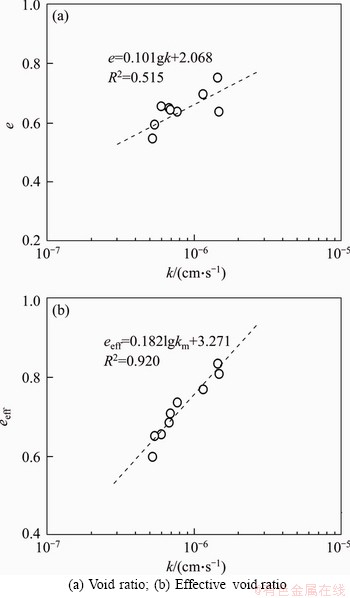 Figure 9(a) depicts the relationship between void ratios and coefficients of permeability of the soil with various kaolin contents and dry densities. It shows that the relationship between void ratios and coefficients of permeability in a logarithmic scale can broadly be characterized by a linear function. However, the fitting effect is relatively bad (R2=0.515), which indicates that the permeability of the studied soil cannot be expressed by the void ratio alone. Thus, the influence of kaolin content needs to be incorporated into the permeability equation. For this reason, the effective porosity that takes both the porosity and kaolin content into consideration is introduced. The effective porosity has the following form [15]: