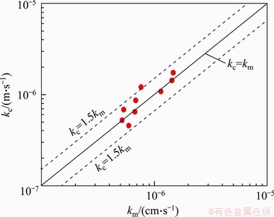 Figure 10 Relationship between calculated (kc) and measured (km) coefficients of permeability