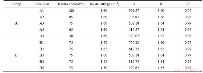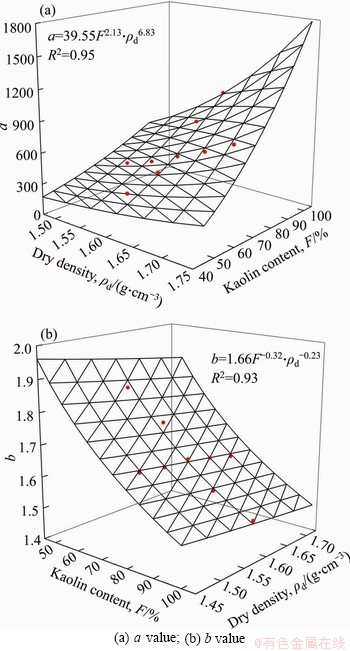 The measured water retention curves of the soil with various kaolin contents and dry densities were fitted with the van Genuchten model. Table 3 gives the fitting constants of this study. One can note that the a value significantly reduces with the decrease in kaolin content and dry density. On the other hand, the b value slightly increases with decreasing kaolin content and dry density. Thus, the fitting parameters of van Genuchten model can be defined as functions of the kaolin content and dry density: