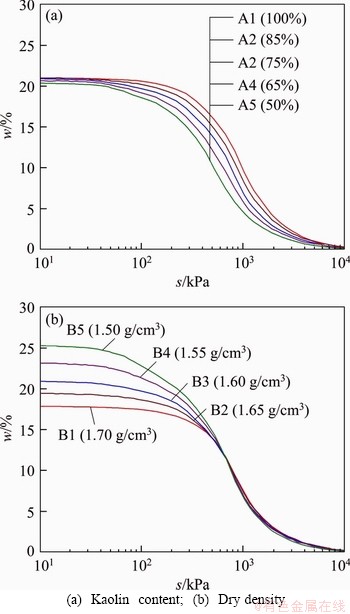 3) The larger the dry density or kaolin content is, the fewer the reduction of water content is, and thus the larger the water retention capacity is. The reason is probably that the specimen with a higher kaolin content or dry density has very fine pores, which highly restrains the drainage of water. The water retention curves of the specimens with different kaolin contents and dry densities can be characterised by the modified van Genuchten model and pore parameters-based equations.