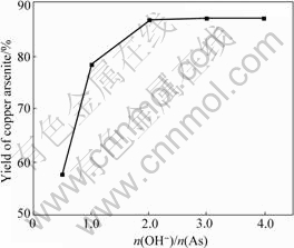 Fig.1 Impact of n(OH-)/n(As) on yield of copper arsenite