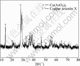 Copper arsenite was prepared by dissolving copper sulphate in arsenious solution that was obtained by dissolving As2O3 in NaOH solution. Concentrated H2SO4 was used to adjust pH value of the solution. The quantitative contents of Cu and As of product were analyzed by chemical analysis. The structure of product was detected by X-ray diffractometer (D/max-rA, Rigaku Corporation of Japan).