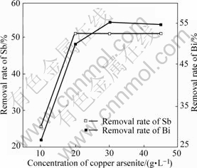 Fig.11 Impact of concentration of copper arsenite on removal rate of Sb and Bi