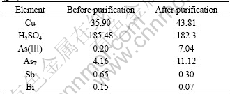 The purification experiment was carried out by dissolving copper arsenite in the electrolyte under stirring for several hours. The purified electrolyte was then filtered to remove the precipitate. The content of antimony and bismuth in the electrolyte was determined by ICP emission spectroscopy( IRIS Intrepid II XSP, Thermo Elemental Corporation, America) and the content of Cu, H2SO4 and As by chemical analysis.