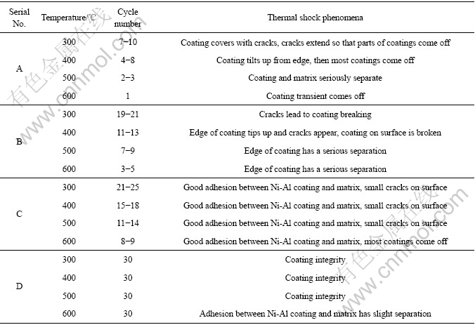 热震实验采用整体加热法。试样整体放入电阻炉中保温15 min后迅速取出水淬,对试样表面进行观察。本实验以涂层非边角处大面积的平面涂层出现剥落的程度作为失效判据, 力图克服边角的外界离散几何因素的影响, 提高实验结果的准确性。